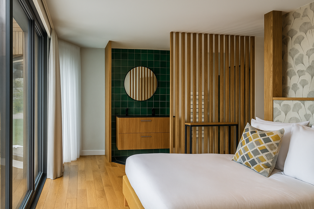 Réalisée en ossature bois, elle associe un bardage naturel et une toiture-terrasse végétalisée afin de répondre pleinement aux attentes des clients et de renforcer l’esprit naturel du lieu.